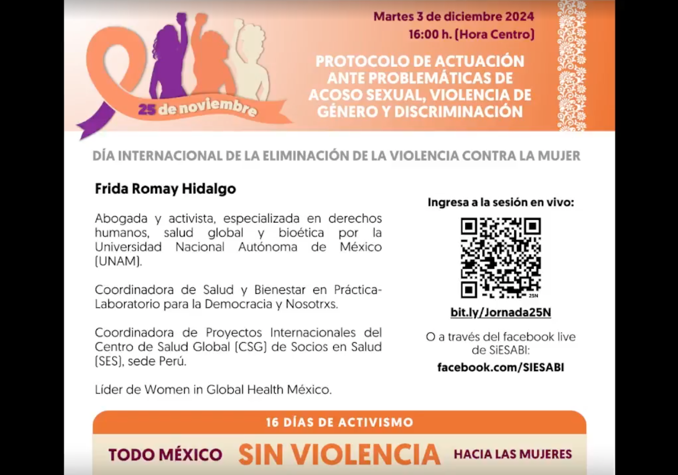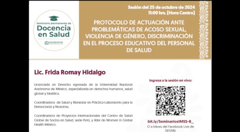 En nuestra sesión 11 en colaboración con SiESABI conocerás protocolos de acción ante situaciones de acoso sexual, violencia de género y discriminación en la formación de recursos humanos en salud.
